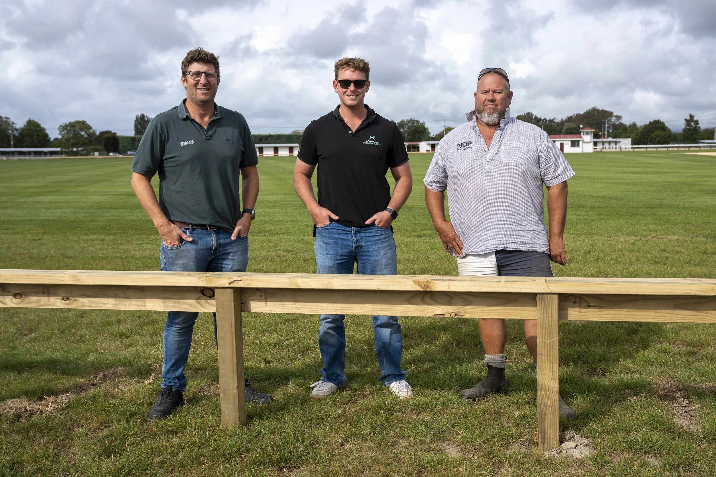 From left to right; Andrew Cranswick, Tumu Timbers Operation Manager, Ike Baker, Tōmoana Showgrounds Manager, Nigel Parkinson, NDP Fencing Owner